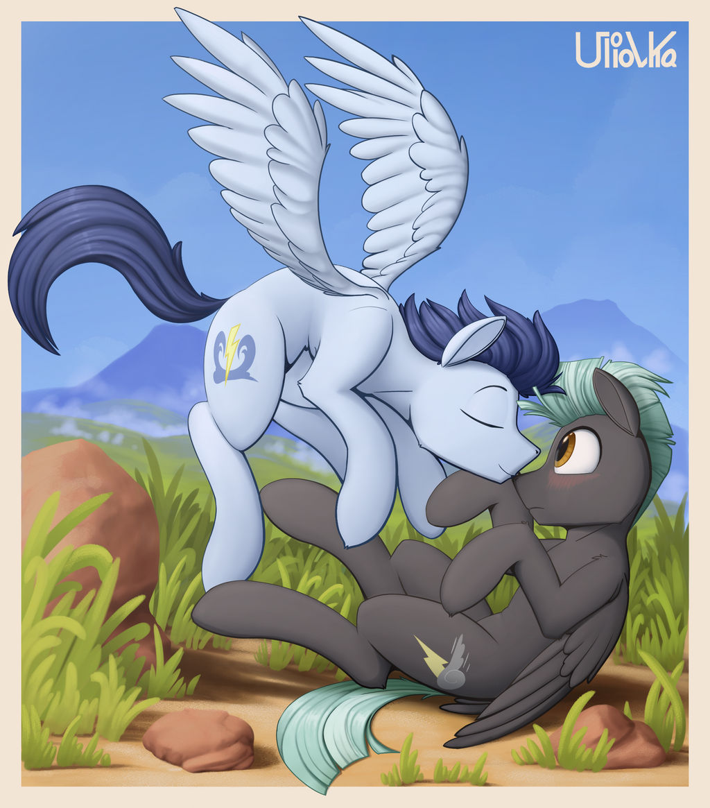 With the big gay month coming soon, here's a... gay moment. Heh, Thunderlane looks so surprised and blushing from Soarin's little kiss. I wonder what led up to this and the boys' positions; one in the air and the other on his back.